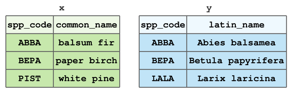 For this part, you’ll first work with the small datasets x and y presented in class to get started with joins. After a few exercises, you’ll move to some real data from the US Forest Service Forest Inventory & Analysis (FIA) program to gain more experience joining complex datasets.