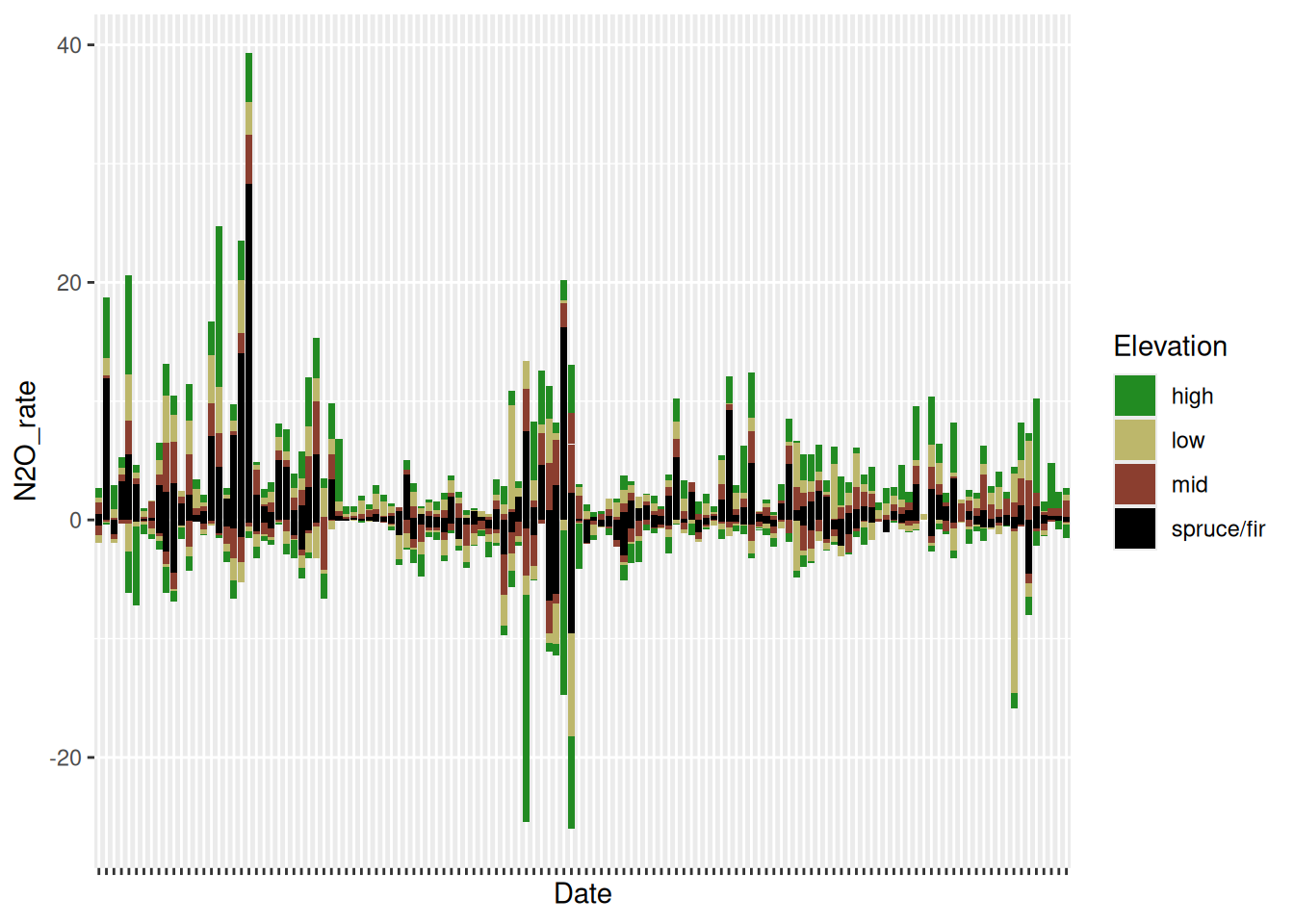 Another peculiar thing to note about this 6-7-year mark is the presence of spruce/fir plots sometimes dominating the other elevations in number, a rather unique characteristic of the N2O observations.