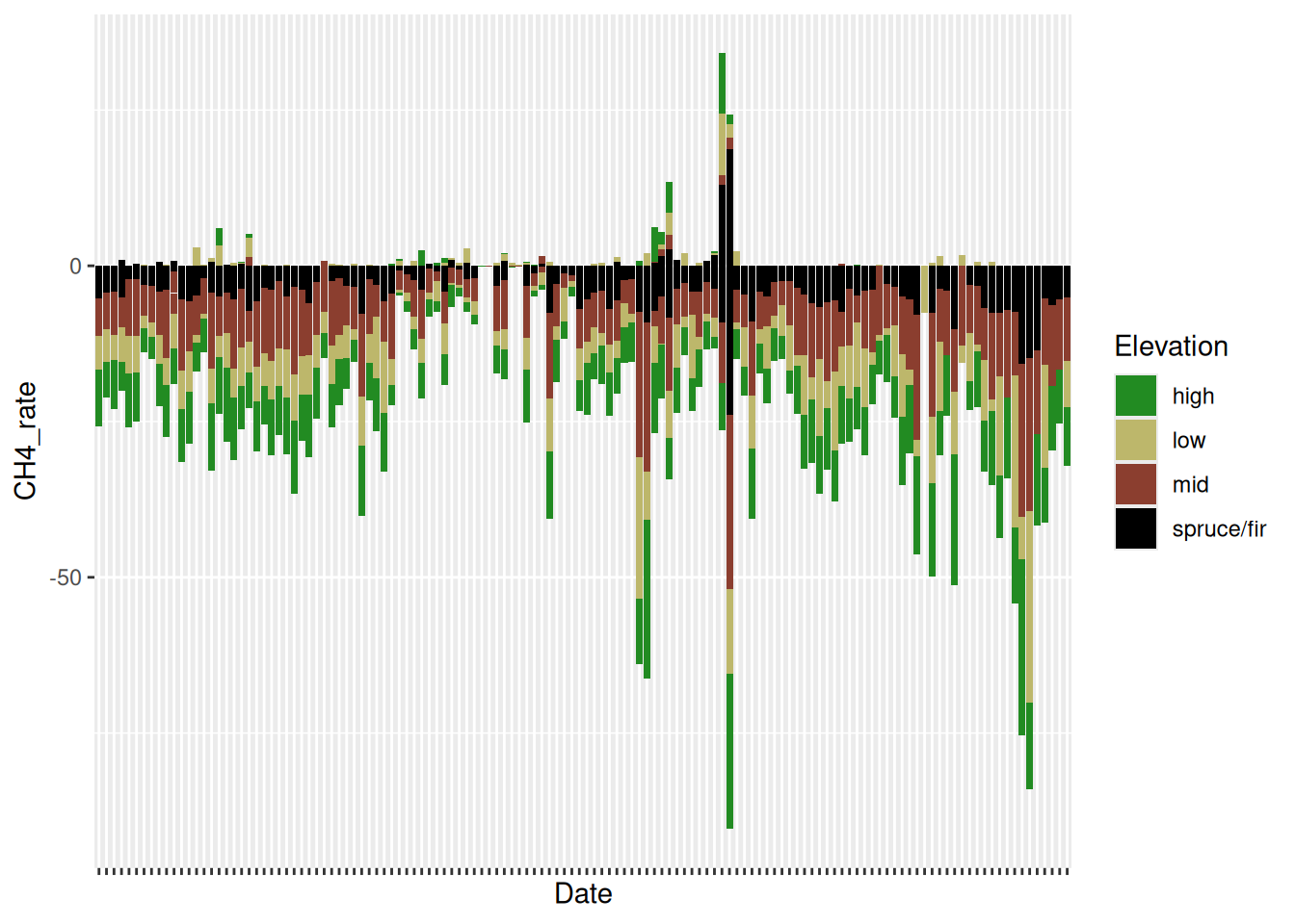 ggplot(data = data, mapping = aes(y = CH4_rate, x = Date, fill = Elevation)) +